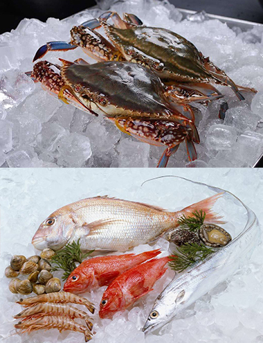 在海鮮市場主要在海鮮上鋪一層冰,是海鮮溫度降低,起到保鮮作用